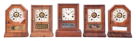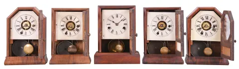 Clocks- 5 (Five): (1) Seth Thomas Clock Co., Plymouth Hollow, Conn., cottage shelf clock with a spring driven, 30 hour, time and alarm movement in a rosewood veneered case, c1865. (2) Seth Thomas Clock Co., Plymouth Hollow, Conn., cottage shelf clock with