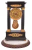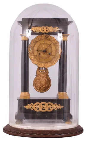 French, 8 day, time and strike, spring brass movement marble 4-column empire mantel clock. Black marble case has some roughness on the base just below the columns, the molding just below the block top and a couple chips on the block top. Original gilt dial has some wear to the numbers. Original hands and pendulum. The right rear foot is replaced. Also included is an large round glass dome with a marble and wood base. The dome works with clock, but not original.