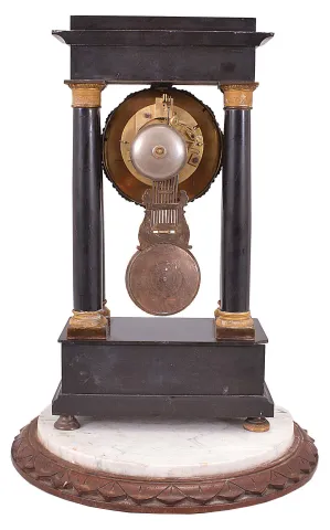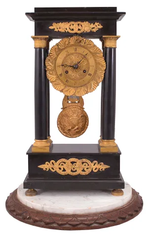 French, 8 day, time and strike, spring brass movement marble 4-column empire mantel clock.