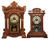 Clocks- 2 (Two): (1) Seth Thomas Clock Co., Thomaston, Conn., "Giants, No. 1" shelf clock with a spring driven, 8 day, time, half hour strike and alarm movement in an oak case, c1904.) (2) Seth Thomas Clock Co., Thomaston, Conn., "Buffalo" shelf clock with a spring driven, 8 day, time, strike and alarm movement in a walnut case, c1886. (1) The case has some original finish and is in good condition. The paper dial, hands and stenciled door glass are all original. (2) The case is in very good condition with some original finish. The dial, hands and door glass are all original.