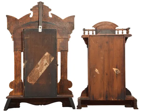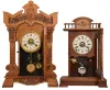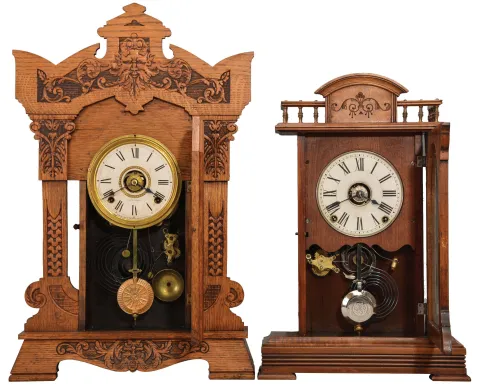 Clocks- 2 (Two): (1) Seth Thomas Clock Co., Thomaston, Conn., "Giants, No. 1" shelf clock with a spring driven, 8 day, time, half hour strike and alarm movement in an oak case, c1904.) (2) Seth Thomas Clock Co., Thomaston, Conn., "Buffalo" shelf clock