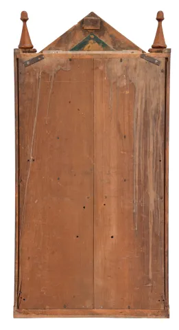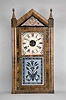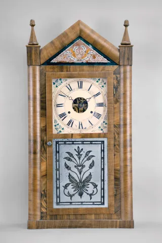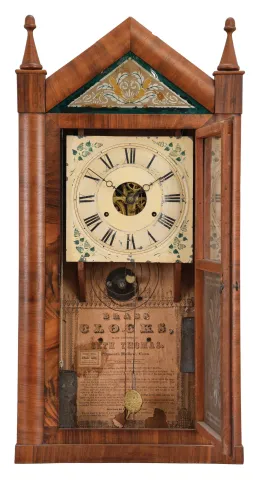 Refinished mahogany veneered case has some veneer missing on the sides at the base and a small knick on the top crest. Original painted dial has scattered loss and inpainting in the center area. Original bottom Fenn tablet. Original tablet in top has some background loss. Clean label inside. Movement is signed. This was Seth Thomas's version of the steeple clock. The company did not introduced a typical style steeple until years later.