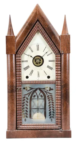 Brewster & Ingrahams, Bristol, Conn., 8 day, time, strike and alarm ripple door sharp gothic or steeple clock. Refinished mahogany veneered case has a little damage and repair at the door hinges. There is a small veneer blister at right side molding. Original painted dial has some minor wear at the chapter ring and minor loss at the mounting pins. Original hands and tablet. Dark label inside.