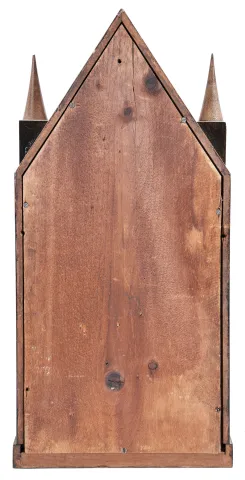 Brewster & Ingrahams, Bristol, Conn., 8 day, time, strike and alarm ripple door sharp gothic or steeple clock.