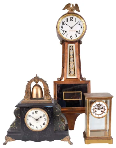 Clocks- 3 (Three) Time and Strike: (1) France, crystal regulator, 8 day, time and strike, spring-driven pendule de Paris movement with a visible Brocot escapement in a glazed brass case with white enamel dial with Roman numerals, c1910; (2) E. Ingraham, Bristol, Conn., "Nyanza" banjo clock, 8 day, time and strike, spring-driven movement in a mahogany case with white paper dial and large eagle finial, c1915; (3) Wm. L. Gilbert Clock Co., Winsted, CT "Curfew", 8 day, time and strike, spring-driven movement in a black enameled wood case with marbelized sides and prominent bell on top, c1910. (1) Crystal regulator lacking pendulum; (2) Wood finial replaced by cast metal eagle. Dimensions are for the Nyanza wall clock. Sold "as is".