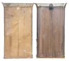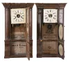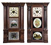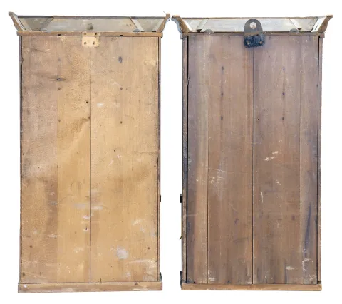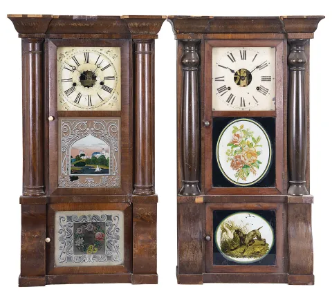 (1) The case has veneer loss along the base and the cornice rim. The original painted dial has some loss and some age discoloration. The hands are original. The case interior case label is in very good condition. All three door glasses are original. The lower glass is in excellent condition. The middle glass has a small area of paint loss. (2) The case has multiple areas of veneer loss. The movement is signed. The hands are original. The original painted dial shows some loss. All three door glasses are original with minimal loss to the lower two.