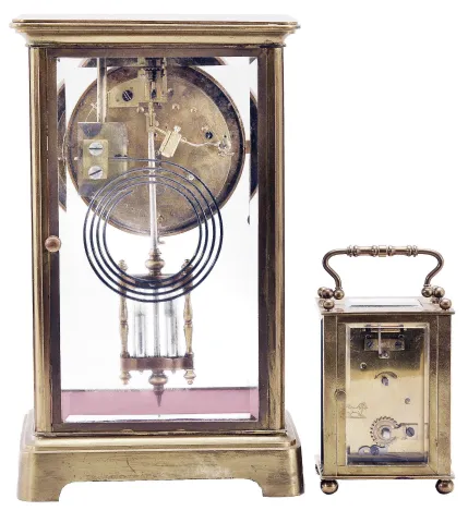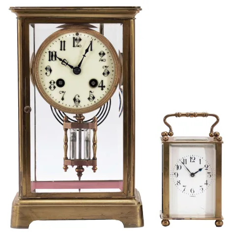 Clocks- 2 (Two) French Brass and Glass: (1) Japy Freres & Cie., Paris, crystal regulator, 8 day, time and gong strike, spring-driven pendule de Paris movement with double-vial pendulum in a glazed case with beveled glasses, gilt brass corners, top and bottom, 3.5 inch cream porcelain dial with Arabic numerals and blued steel hands. (2) France, carriage clock, 8 day, time only, spring-driven movement in a glazed case with beveled glasses on five sides, polished brass case with handle on top, white enamel dial with Arabic numerals, and blued steel spade hands. (1) The lacquer protecting the metal case parts has turned brown. Beveled glasses are good. The porcelain dial is in excellent condition, though missing one brass grommet around a winding arbor hole. The movement ticks and strikes. (2) Brass case has a somewhat dark patina with a few very dark spots. There is a small chip in the lower right corner of the front glass. The dial and hands are in very good condition. The movement was recently serviced and ticks briskly. The platform looks like a newer replacement.