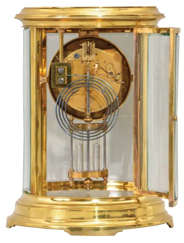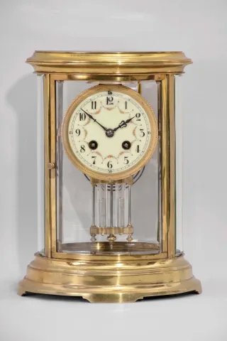French, Marti & Cie, 8 day, time and strike, spring brass movement oval case crystal regulator mantel clock.