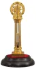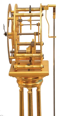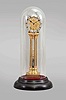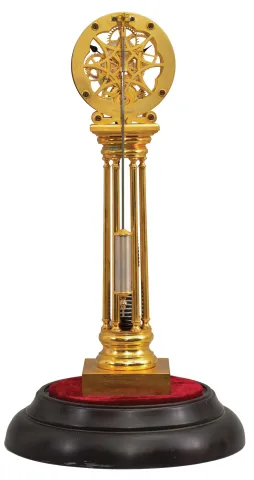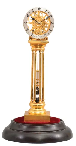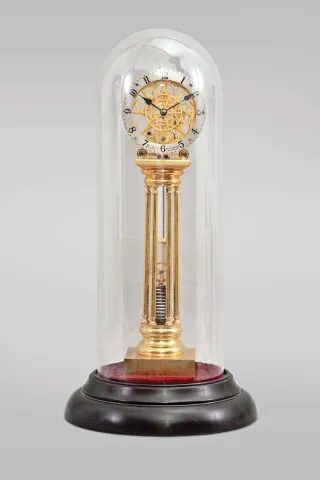 Asian, modern reproduction fusee skeleton clock under glass dome, 8 day, time only exposed movement powered by an extended coiled spring, silvered chapter ring reading "WU Smith, Musselburgh / Maker & Inventor", mounted on a velvet-covered black molded base, late 20th century. there is a light amount of dust and tarnish on gilded surfaces. Silvered dial is in excellent condition Some fine scratches to black base. There is surface rust on the fusee chain. Dimensions include glass dome.