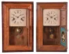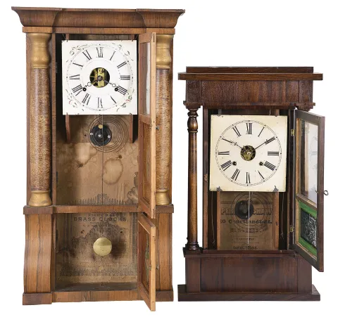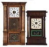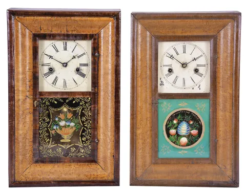 Clocks- 4 (Four): (1) Seth Thomas Clock Co., (for S. J. Southworth, Leeds County, Canada West) "Rose Column" clock with a weight driven, 8 day, time and strike movement in a rosewood veneered case, c1865. (2) Unidentified miniature OOG shelf clock with a spring driven, 30 hour, time and strike movement in a mahogaNew York and birdseye maple case, c1865. (3) Henry Sperry, 18 Maiden Lane, New York, miniature OOG shelf clock with a spring driven, 30 hour, time and strike movement in a mahogaNew York and birdseye maple case, c1855. (4) Sperry & Shaw, 10 Cortlandt St., New York, New York Style 4 column shelf clock with a weight driven, 30 hour, time and strike movement in a mahogaNew York and rosewood veneered case, c1845 (1) The case is in good condition with a light finish remaining. There is veneer loss along the base and at the right cornice return. The original painted dial shows some wear and restoration. The hour hand is original while the minute hand is a replacement. The movement is signed. The door glasses are original. (2) The birdseye maple veneer is in somewhat rough condition. The original painted dial shows loss at the winding holes. The hands are replaced. The door glasses are original. (3) The case is in good condition but has veneer lifting on the round banding. The original painted dial shows some paint loss. The hands are replaced. The door glasses are original. (4) The case is in good condition with a newer finish. The original painted dial is in nice condition with some loss at the mounting holes. The hands are original. The door glasses are original. The movement is signed "Sperry & Shaw, New York".