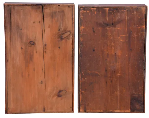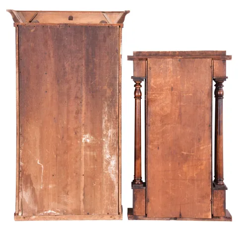 (1) The case is in good condition with a light finish remaining. There is veneer loss along the base and at the right cornice return. The original painted dial shows some wear and restoration. The hour hand is original while the minute hand is a replacement. The movement is signed. The door glasses are original. (2) The birdseye maple veneer is in somewhat rough condition. The original painted dial shows loss at the winding holes. The hands are replaced. The door glasses are original. (3) The case is in good condition but has veneer lifting on the round banding. The original painted dial shows some paint loss. The hands are replaced. The door glasses are original. (4) The case is in good condition with a newer finish. The original painted dial is in nice condition with some loss at the mounting holes. The hands are original. The door glasses are original. The movement is signed "Sperry & Shaw, New York".