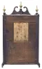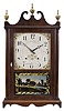 Mahogany and mahogany veneered case in an old finish has a broken tip and a repair on the skirt, the feet have been shortened and poor repair to the scrolls. One side return is missing. Original tablet has heavy loss. The dial is probably original to the case with scattered loss and wear to chapter ring and plugged holes that indicate this case may have had another movement at one time. The current movement was made by Seth Thomas. Hands look to be modern replacements. Dust cover behind the movement is missing. Period set of Terry type finials that most likely not original as they are the wrong type for this maker. Clean label inside.
