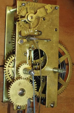 Seth Thomas Clock Co., Plymouth Hollow Hollow, Conn., 30 hour, time and strike, weight wood movement pillar & scroll shelf clock.