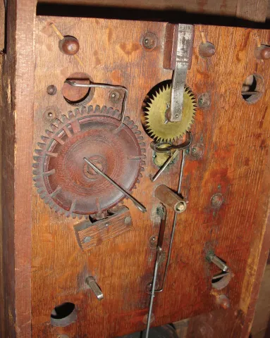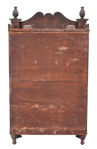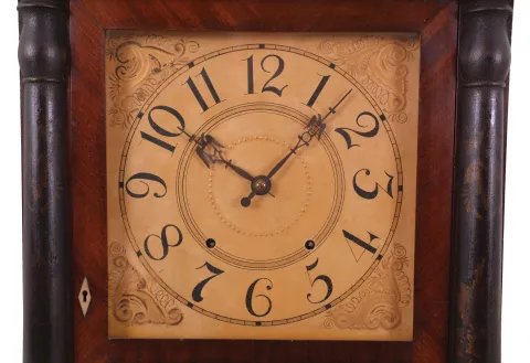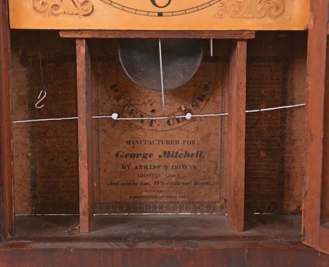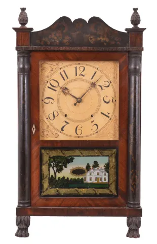 Mahogany veneered case in an old finish in nice condition with original stencils. Dial has been restored and whatever finish that was applied has yellowed. Original glass tablet has been restored in place. Tablets with this large gold leaf border has been seen on several other Mitchell clocks. Period 'eagle" hands, carved paw feet and pineapple finials. Dark, but readable label inside.
