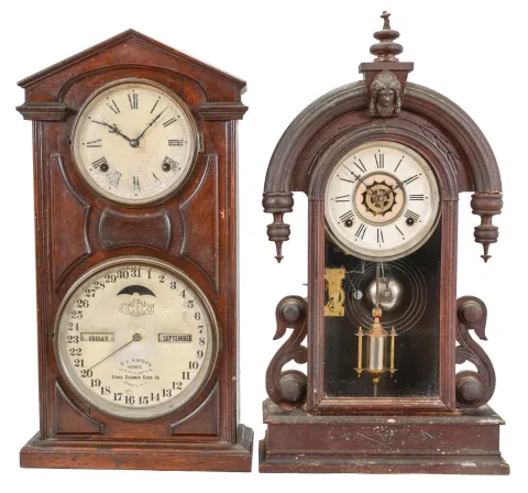 Clocks- 2 (Two): (1) Waterbury Clock Co., Waterbury, Conn., "Paris", 8 day, time and strike, spring brass movement shelf clock, c1891 (2) Ithaca Calendar Clock Co., Ithaca, New York, "No. 7 Shelf Cottage", 8 day, time and strike, spring brass movement double dial calendar clock, c1880 (1) Walnut case in as found condition in original finish. Original paper dial is clean for its age. Center finial has a broken tip. Tablet is missing. Original hands. (2) Walnut case in good condition in original finish has a piece of molding on the upper right side missing. Original paper time dial has an abraded surface. Original calendar dial has stains and has age darkened. The hands on the time dial look to be replacements. The calendar hand is missing it's tail.