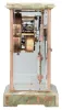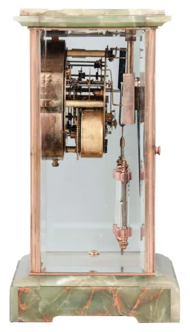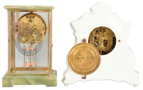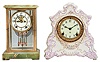 (1) Onyx and brass case has a corner chip on the base, some roughness on the back corners and a rough top front edge. Original porcelain dial has some damage at 2 o'clock. Original hands and pendulum. The right beveled glass panel has a couple corner chips. The rest of the glass panels are fine. This example was retailed by "B. Altman & Co." (2) Decorative porcelain case in nice condition is not named. Original porcelain dial is perfect. Original hands and pendulum. Movement is signed.