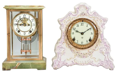 Clocks- 2 (Two): (1) New Haven Clock Co., New Haven, Conn., 8 day, time and strike, spring brass movement onyx top and bottom crystal regulator with visible escapement, c1911 (2) Ansonia Clock Co., New York, 8 day, time and strike, spring brass movement porcelain mantel clock, c1904 (1) Onyx and brass case has a corner chip on the base, some roughness on the back corners and a rough top front edge. Original porcelain dial has some damage at 2 o'clock. Original hands and pendulum. The right beveled glass panel has a couple corner chips. The rest of the glass panels are fine. This example was retailed by "B. Altman & Co." (2) Decorative porcelain case in nice condition is not named. Original porcelain dial is perfect. Original hands and pendulum. Movement is signed.
