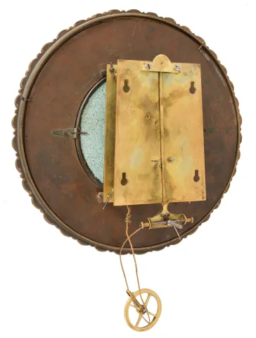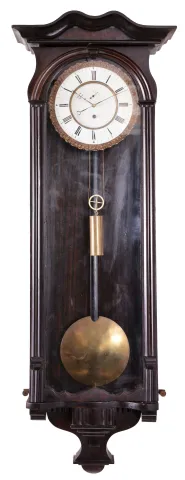 Austria or Germany, Vienna regulator, 8 day, time only, weight-driven movement in a walnut case with serpentine crest, two-piece porcelain dial with pie crust bezel with subsidiary in sunk portion, brass pendulum disc and weight, c.1890 Small piece or molding is broken off of the back right corner of the case. Fine hairline crack under the winding arbor. Subsidiary dial is a bit faded. Hands appear original. Front glass is a replacement. Movement ticks.