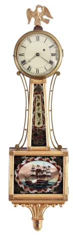Unknown maker, reproduction, 8 day, weight brass movement patent or banjo timepiece. Nicely made mahogany gilt front case has a small piece of the rope molding missing at the top of the throat frame and some minor loss to the gilding. Nice repro tablets and eagle finial. There is some loss to the gilt balls on the bottom bracket. Modern movement by Kilbourn & Proctor, Osterville, MA.