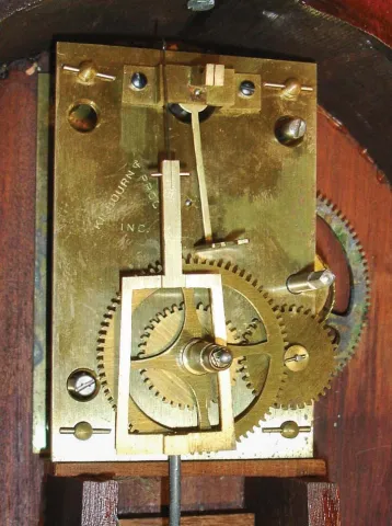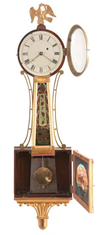 Unknown maker, reproduction, 8 day, weight brass movement patent or banjo timepiece.