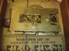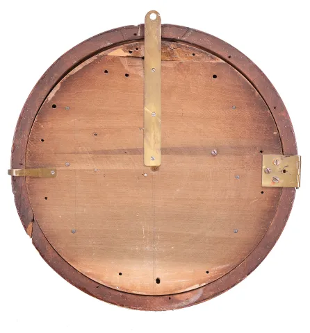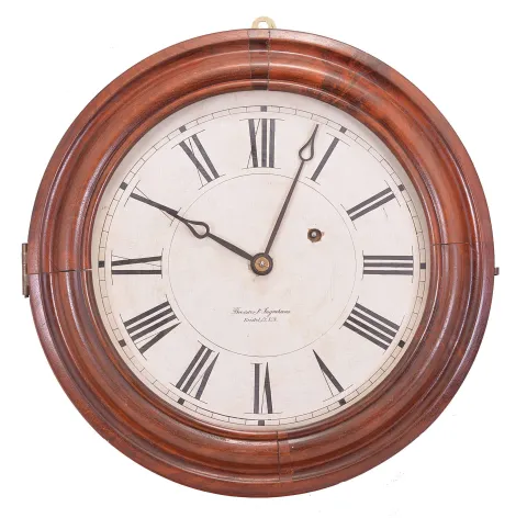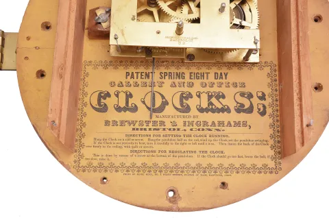 Brewster & Ingrahams, Bristol, Conn., Gallery hanging clock with an 8-day spring driven East-West timepiece movement with a brass spring in a crotch mahogany case. The case is in very good condition with some original finish. There are two wood inserts in the bezel, however they appear to be from the factory. The 10 inch original painted wooden dial is in very good condition with minor loss at the pin mounting points. There are two newer stretchers behind the dial to mitigate warping. The hands are original. The movement is clean and running. The yellow label inside the case is spectacular. An excellent example.