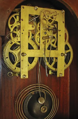 The case is in very good condition with some original finish. There are two wood inserts in the bezel, however they appear to be from the factory. The 10 inch original painted wooden dial is in very good condition with minor loss at the pin mounting points. There are two newer stretchers behind the dial to mitigate warping. The hands are original. The movement is clean and running. The yellow label inside the case is spectacular. An excellent example.