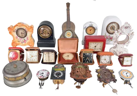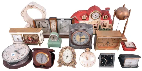 Clocks- 35 (Thirty-five) Small Clocks: large assortment including many antique and vintage travel clocks, alarm, and novelty clocks by makers such as Keebler, Sheffield United, Ansonia, Terry Clock Co., Lux, Westclox Ingraham, Movado, Bulova, Imhof, and others. Sold "as is".