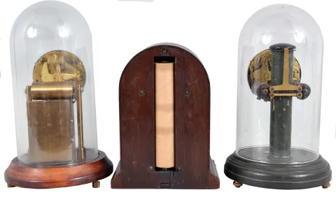 Clocks- 6 (Six) Electro-mechanical: (1) Poole Mfg Co., Ithaca, New York "Executive" battery-powered desk clock with molded bakelite base and glass dome; (2) Poole Mfg Co., Ithaca, New York, round top battery-powered mantel clock in a mahogaNew York case