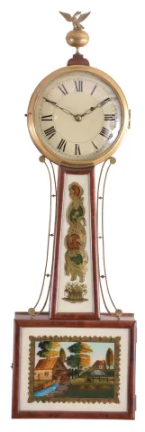Massachusetts, 8 day, weight brass movement Patent or banjo timepiece. Mahogany case in very nice condition an old mellow finish. Both tablets done on old glass are replacements and copies of W. W. Sprague & Co. tablets. Original dial has been repainted. Original hands. Movement is currently attached to the back plate with a screw, but there is evidence it may have been originally attached with through bolts. Nice J-hook lead weight.