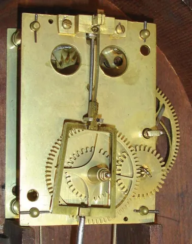 Mahogany case in very nice condition an old mellow finish. Both tablets done on old glass are replacements and copies of W. W. Sprague & Co. tablets. Original dial has been repainted. Original hands. Movement is currently attached to the back plate with a screw, but there is evidence it may have been originally attached with through bolts. Nice J-hook lead weight.