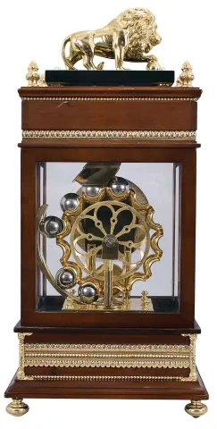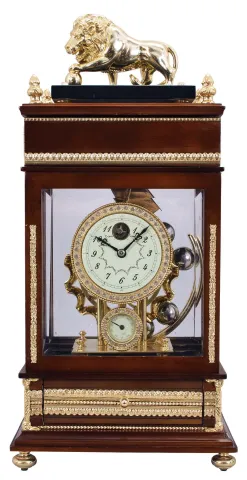Chinese reproduction of a Ferris Wheel falling ball gravity mystery timepiece. The balls move down an inclined plain through the top of clock on the Ferris wheel and supply weight to run the clock. The balls exit the case and fall into a draw below to be