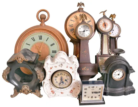 Clocks- 22 (Twenty-two) Assorted Clocks: wide variety of vintage and antique clocks by makers including International, Seth Thomas, Kienzle, Turner, New England Clock Co., New Haven and many others. Lot also includes two cases and one wall bracket.