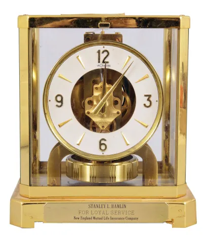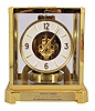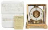 Jaeger- LeCoultre, Switzerland, "Atmos" clock, 15 jewel, caliber 528-8/6 movement, torsion pendulum, round metal dial with applied gilt arrow markers and numbers, gilt hands, all contained in a glazed rectangular case with original styrofoam packaging box