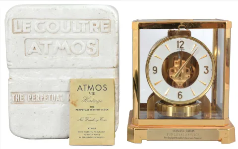 Jaeger- LeCoultre, Switzerland, "Atmos" clock, 15 jewel, caliber 528-8/6 movement, torsion pendulum, round metal dial with applied gilt arrow markers and numbers, gilt hands, all contained in a glazed rectangular case with original styrofoam packaging box, serial #220770. Lacquer on gilt case is cloudy in many spots but the case itself looks good. Glass is dirty but in good condition. Hands and dial are fine. Movement ticks, but was not tested long term.