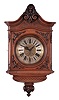 Gustav Becker, Freiberg, Germany, cartel clock, 8 day, time only, spring driven movement in a walnut veneered case in the second baroque style with carved scrolls and floral elements with a roman numeral silvered brass dial, and pieced blued steel hands. case has a nicely rubbed down finish with one small veneer loss on the upper left side. Bottom finial will need to be glued. Entire surface of the silvered dial has slightly yellowed. The minute hand was bent, but straightened. Old glass in door, lock has a working key. Signed trapezoidal movement has the Medaille d'Or award stamp and serial number 14099.