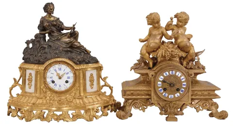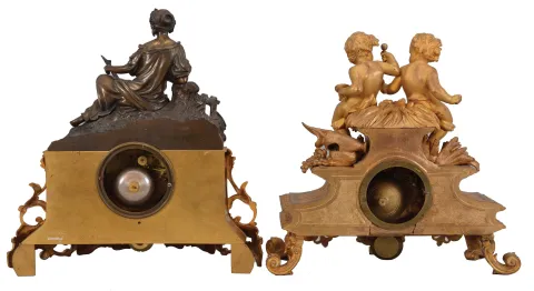 (1) Cast metal case in nice condition has almost all the original gilding intact and finish on the statue. Original porcelain dial has some damage at the time side winding arbor. Period hands look original, but minute hand too short. Movement is signed. (2) Cast spelter case in nice condition has most of the gilding intact with some wear to the high spots. There are a couple cracks in the case back and a couple small pieces broken off just behind the left putti. The porcelain numbers are fine. Minute hand is missing and the other hand is not original. Movement is signed.