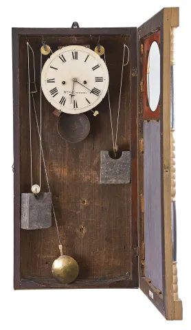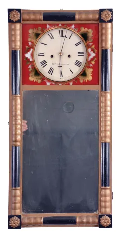 William G. Emerson, Newport, Maine, 8 day, time and strike, weight driven brass movement New Hampshire style mirror clock.