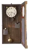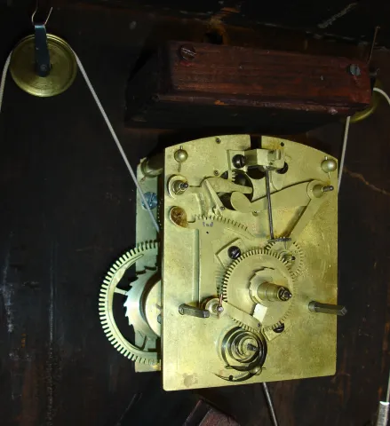 Stained pine case and mirror has a strip of hardboard added to reinforce the base. The gilt areas on the mirror frame now have gold paint. Dial glass and mirror are later replacements. The movement and dial are original to each other, but we feel the movement and dial did not start life in this case as there are inpainted areas on the dial that do not match the current method of attachment. A picture of an Emerson movement and dial can be found in "Clockmakers & Clockmaking in Maine 1770-1900" by Joseph Katra, page 132.