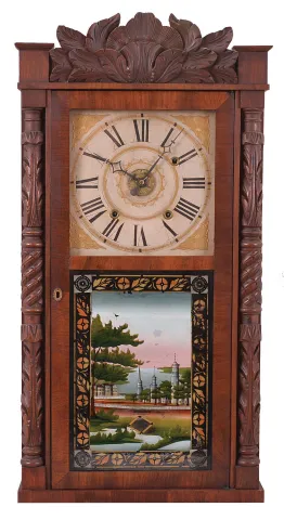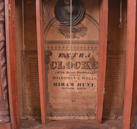 Boardman & Wells for Hiram Hunt, Bangor, Maine, 30 hour, time, strike and alarm weight wood movement carved column and crest shelf clock.
