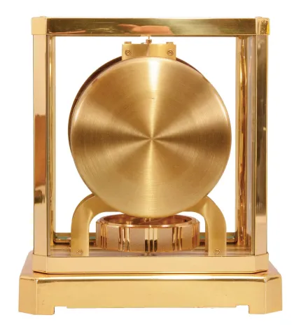 Jaeger- LeCoultre, Switzerland, "Atmos" clock, 15 jewel movement, gilt torsion pendulum, square white painted dial with applied gilt Arabic numerals and arrow markers, gilt hands, all contained in a glazed rectangular case with removable front panel,