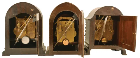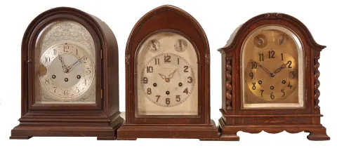 Clocks- 3 (Three) Chiming Mantel: (1) Herschede Clock Co., Cincinnati, OH, chiming mantel clock, 8 day, time and strike with Westminster chime playing on 5 rods, spring-driven movement, serial number 25093 in a round gothic mahogaNew York case, silvered dial with engraved floral motif, c1920; (2) Ansonia Clock Co., Brooklyn, New York, "Sonia No. 4" chiming mantel clock, 8-day, time and strike with Westminster chime in a lancet walnut case with arched silvered dial with raised bronze numerals and subsidiary dials for setting the rate and chime/silent, c1925; (3) Gustav Becker, GermaNew York, chiming mantel clock, 8 day, time and strike with Westminster chime, spring-driven movement in an arch top oak case flanked by barley twist columns, beveled glass door, dial with applied bronze numerals and subsidiary dials for rate adjustment and chime/silent selector, c1900. (1) Case has dark original finish. Silver has been worn through on the dial by the 9 o'clock position. Movement ticks, strikes and chimes but was not tested long term. (2) Case has some surface scratches to finish. Silvered dial is tarnished in spots. Hands have been shortened. Beveled door glass is in excellent condition. Signed movement ticks, strikes, and chimes but was not tested extensively. (3) Grain on the case is raised, but in good condition. The silvered dial has been uniformly rubbed down to brass. Original raised bronze numerals. The gong assembly and original rods are in good condition. Signed movement ticks, strikes, and chimes but was not tested long term. Dimensions are for the Becker. Sold "as is"