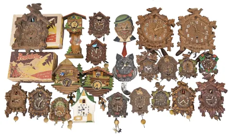 Clocks- 42 (Forty-two) Novelty and Desk: wide assortment of small clocks, some mechanical and some electric. Many Lux pendulettes including models such as the "Cat", "Dixie Boy", "Georgian Banjo", and many cuckoo themed models.