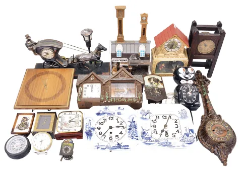 Clocks- 42 (Forty-two) Novelty and Desk: wide assortment of small clocks, some mechanical and some electric. Many Lux pendulettes including models such as the "Cat", "Dixie Boy", "Georgian Banjo", and many cuckoo themed models. Sold "as is".
