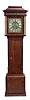 Thomas Moss, Frodsham, England, tall clock, 8 day, time and strike, weight driven movement in an oak case with mahogany banding, bell top, four full reeded Corinthian columns on the hood with painted foliate frieze above dial, reeded quarter columns