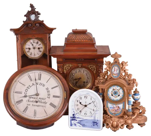 (1) Cast spelter case has been painted gold. The top piece is broken off and will require attention. It holds a porcelain lady's portrait. The right side garland piece is broken off near the end and is detached from the case and will need to be reattached. Porcelain panels and finials are fine. Porcelain dial is fine. Original hands. (2) An English case with graining on the side with an Ansonia Clock Co. movement in an old finish. The advertising paper dial has aged with staining at the mounting screws and looks original. Original hands. (3) Walnut and walnut veneered Rococo-style case in an old finish has some veneer damage on the bottom bracket. Original paper dial is stained with some surface abrasion. Original hands and pendulum. (4) The ceramic front now has a modern battery movement. (5) Walnut case with an old finish has a shrinkage crack in the door. Original dial has scattered scratches. Original hands. The top finials are missing. The rings in the side lion's mouths are missing. Movement is signed.