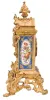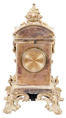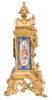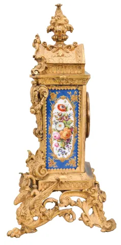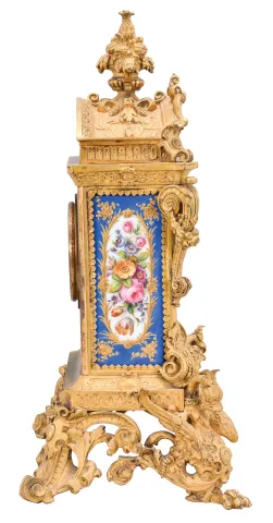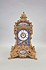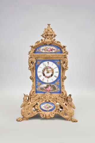 Grohe, a Paris, an ornate, renaissance revival, gilt bronze and porcelain mounted mantel clock, the case resting on gryphon and scroll feet, with dome top and fruit filled urn finial, and replete with rococo and renaissance revival ornament, the panels in