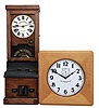 Clocks- 2 (Two): (1) National Time Recorder Co. Ltd., London, England "Standard Card Recorder" with a spring driven, 8 day, timepiece movement and recording mechanism for time of day, morning vs. afternoon and day of the week, c1920. (2) Self Winding Clock Co., New York, "Western Union No. 29R" model master timepiece with a "Style F Self Winding Synchronized Movement" in a solid oak case, c1930. (1) The solid oak case (39x11.5x13.5) is in very good condition with original finish. The painted dial and hands are original, (2) The solid oak case (21x21x6) is in excellent condition and has been refinished. The original painted dial is in excellent condition. The hands are original. The movement is signed.