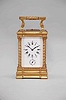 France, a good hour repeating, Anglaise Riche variant carriage clock with alarm, the gilt case with molded base and fluted band supporting twisted columns with Corinthian capitals, the entablature with fluted band, and stepped, molded cornice, case top
