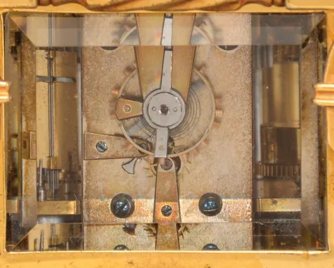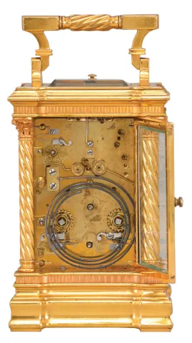 France, a good hour repeating, Anglaise Riche variant carriage clock with alarm, the gilt case with molded base and fluted band supporting twisted columns with Corinthian capitals, the entablature with fluted band, and stepped, molded cornice, case top with folding handle, roman numeral white enamel dial, blued steel distaff hands, three train movement with lever platform, sounding the hour and half hour in passing, and repeating the last hour on demand case with minor spotting, retains an old layer of lacquer which is dirty and failing, minor losses to gilding, left side glass with minor chips at upper left, dial with hairline at alarm chapter and touch ups to numerals, hands good, movement oily, dirty, running, striking, and repeating correctly, alarm functional, would benefit from cleaning, gong with spots of oxide