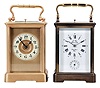 Carriage clocks- 2 (Two), both French, the first with glazed, gilt Corniche case marked "Tiffany & Co.", Arabic numeral white enamel dial with gilt mask and center, blued steel hands, two train movement with cylinder platform, striking the hours and half